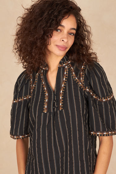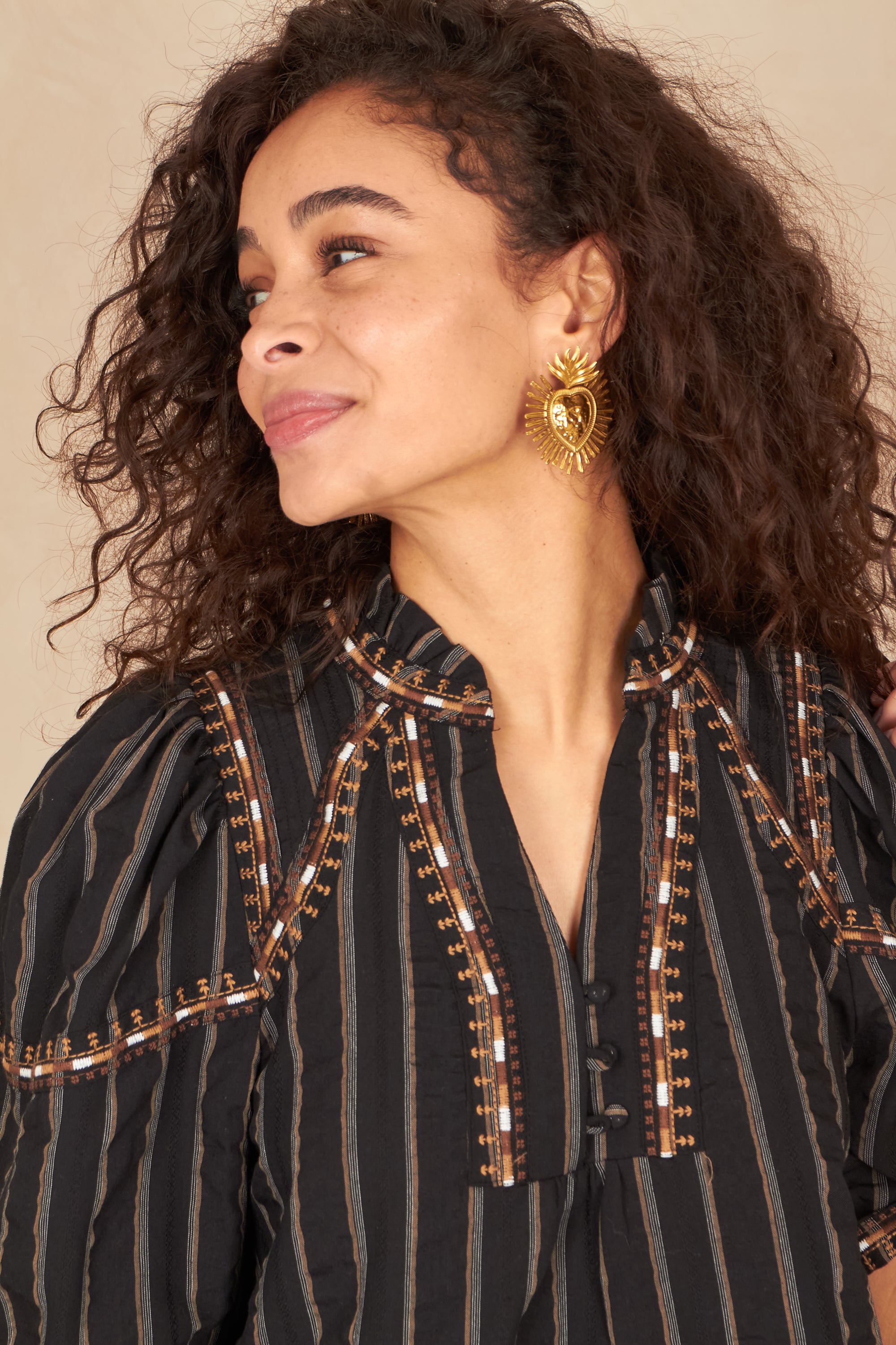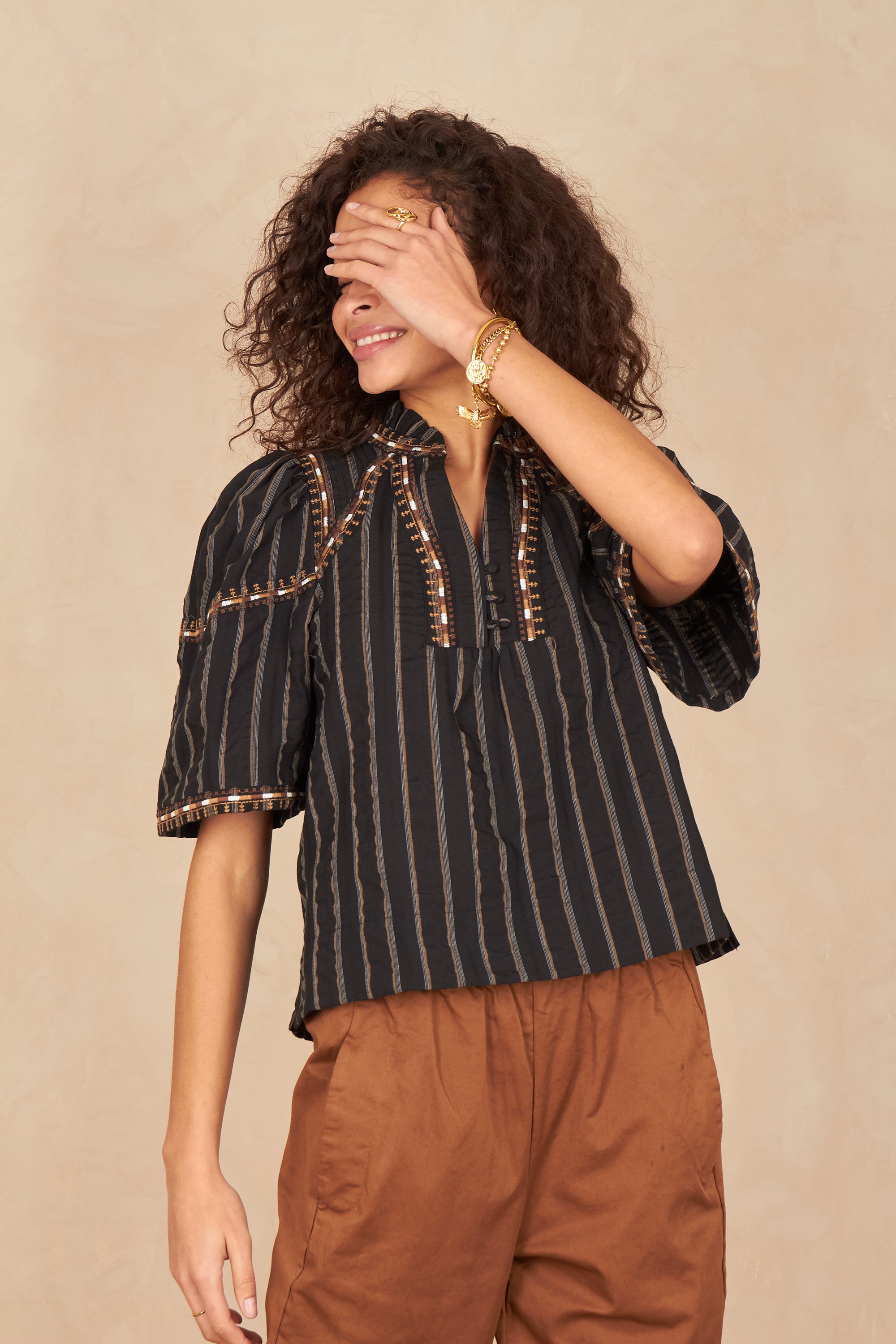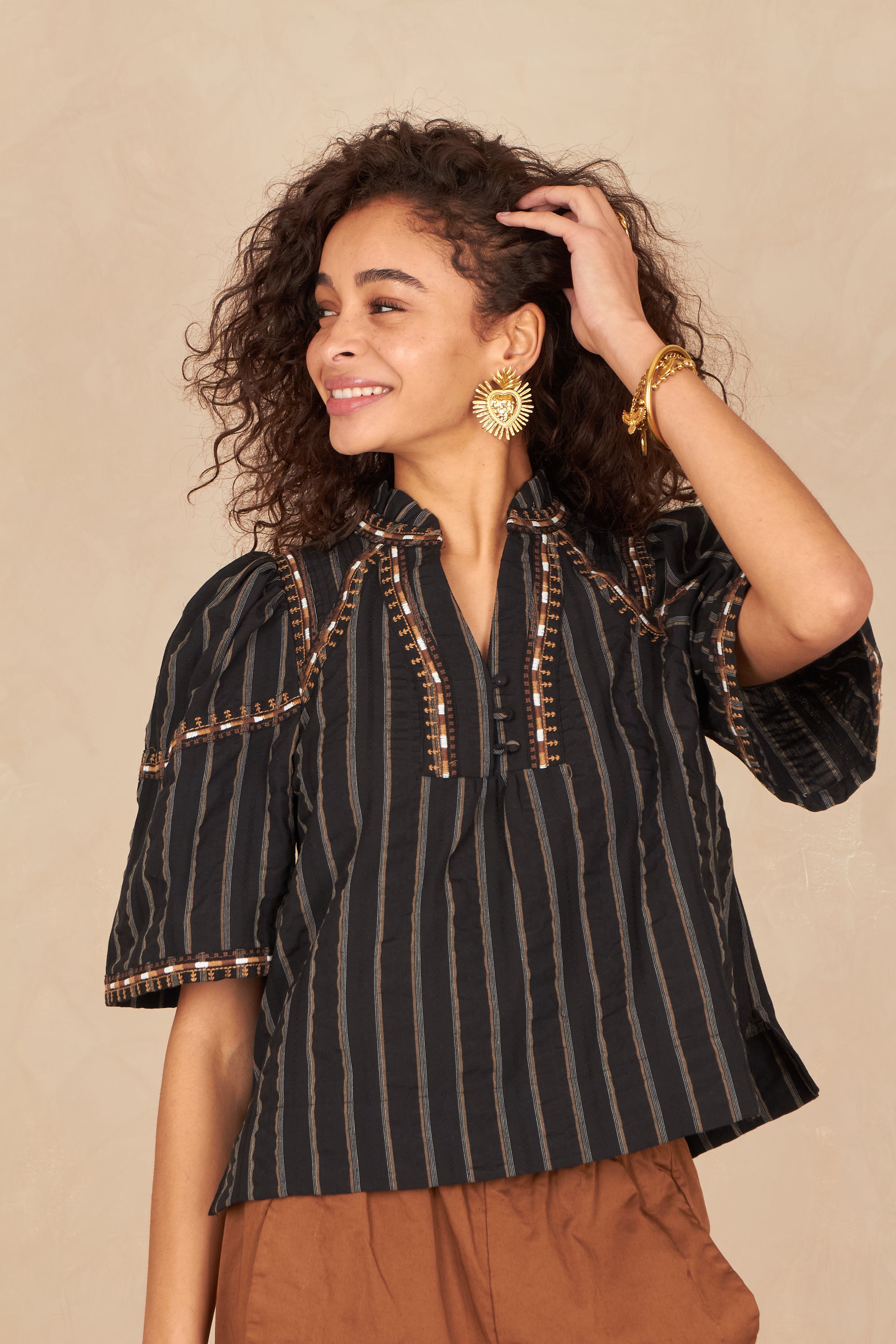 - Détails brodés sur l’encolure et les manches