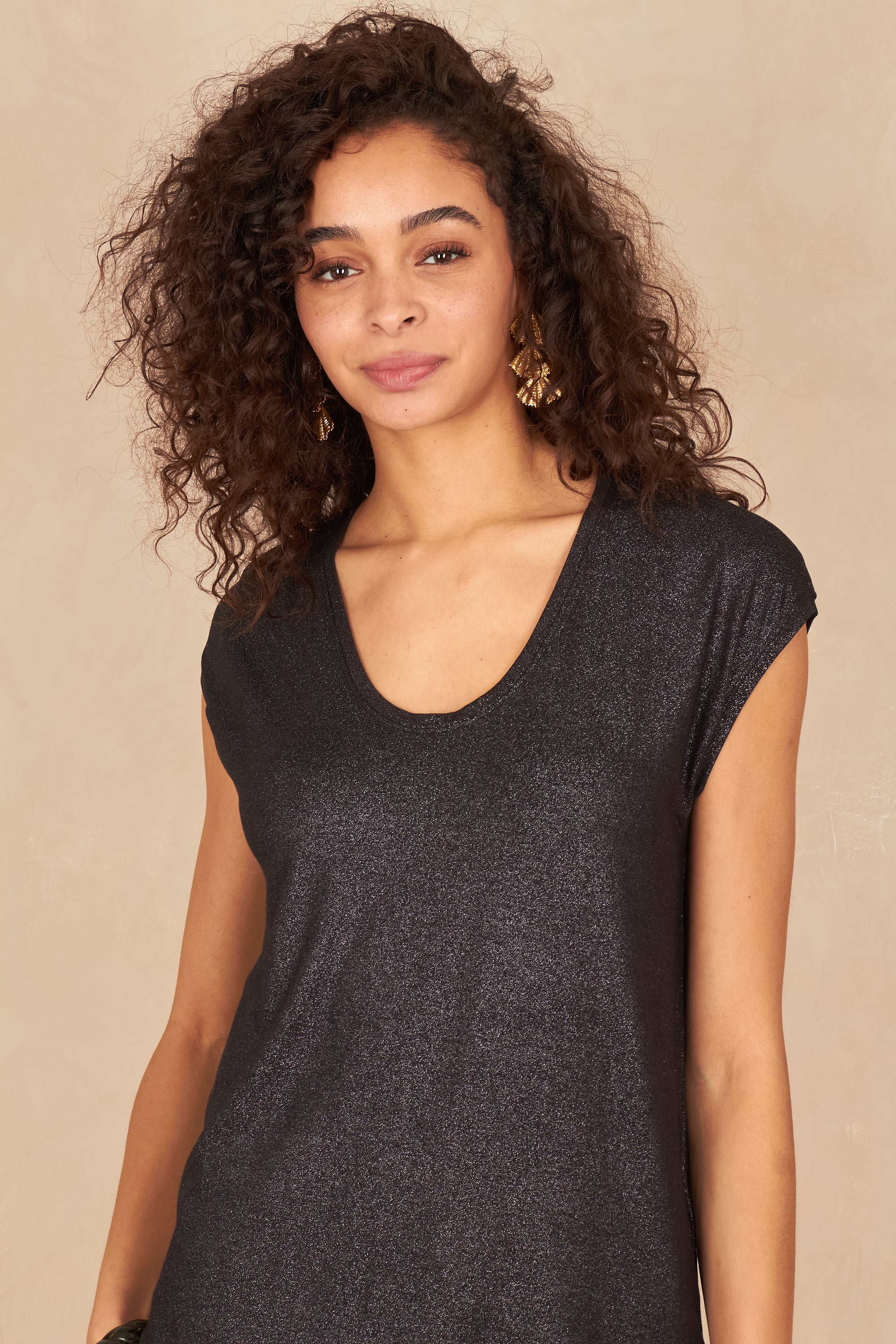 Céline mesure 1m77 et porte une taille S.